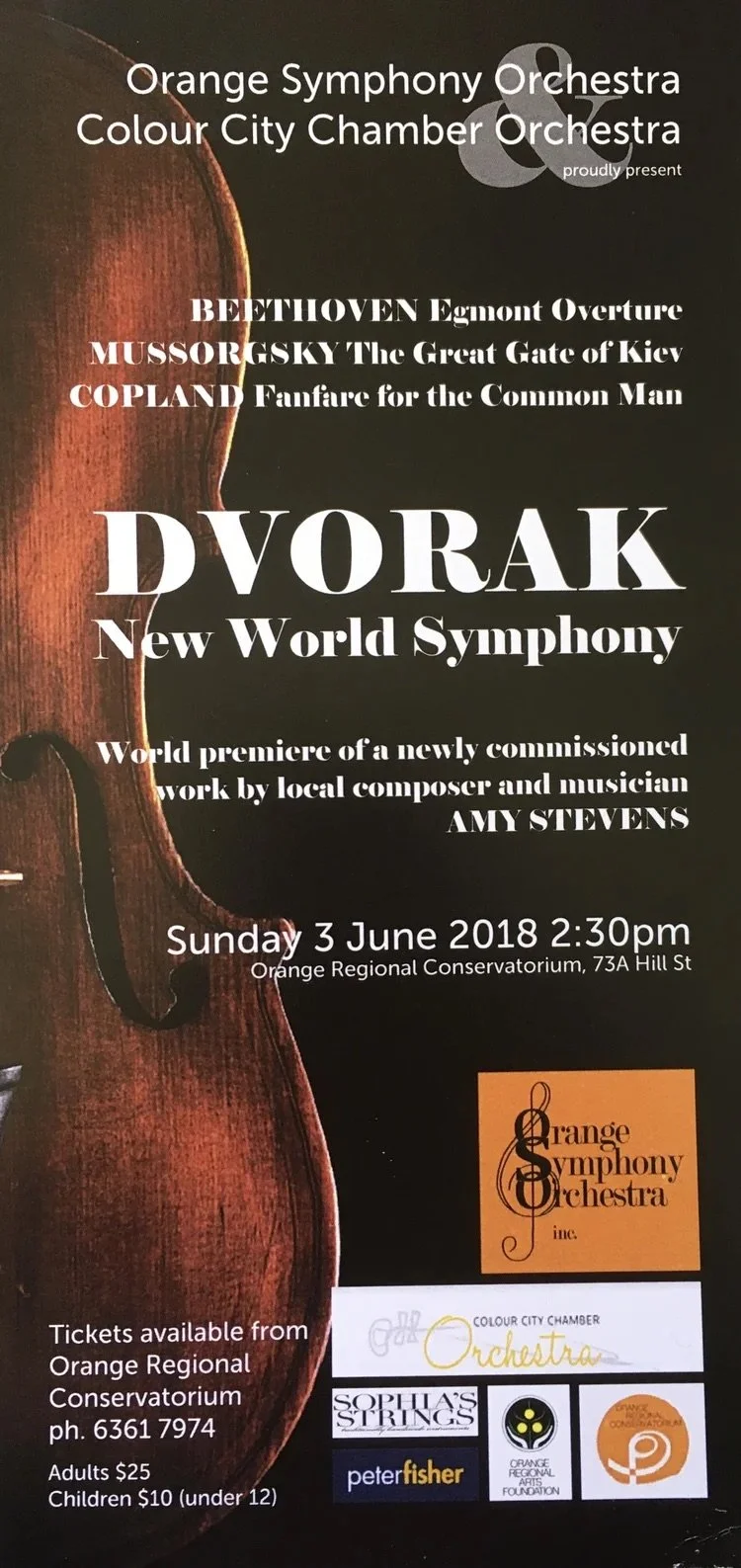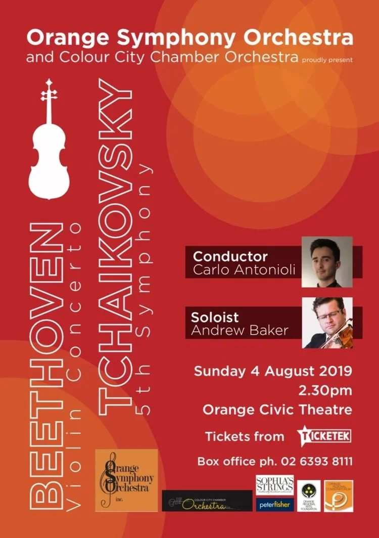 Historical Photo Gallery 18th and 19th November 2023Elijah 25th June 2023At the Movies KWS 26th June 2022Included Mozart’s Flute and Harp Concerto 20th February 2022OSO RETURNS 2nd and 3rd November 2019The Armed Man 4th August 2019Orange Symphony Orchestra and Colour City Chamber Orchestra, Beethoven Violin Concerto & Tchaikovsky 5th Symphony 3rd June 2018Orange Symphony Orchestra and Colour City Chamber Orchestra, New World Symphony Concert, Orange Regional Conservatorium 2017Orange Symphony Orchestra Mozart Requiem & Orange Youth Orchestra Concerto Concert Historical Gallery